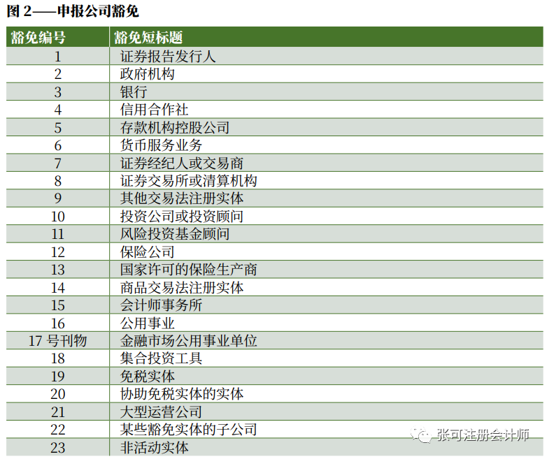 报告规则豁免了二十三 (23) 种特定类型的实体报告要求,如下图 2 所示。符合这些豁免条件的实体无需向 FinCEN 提交 BOI 报告。